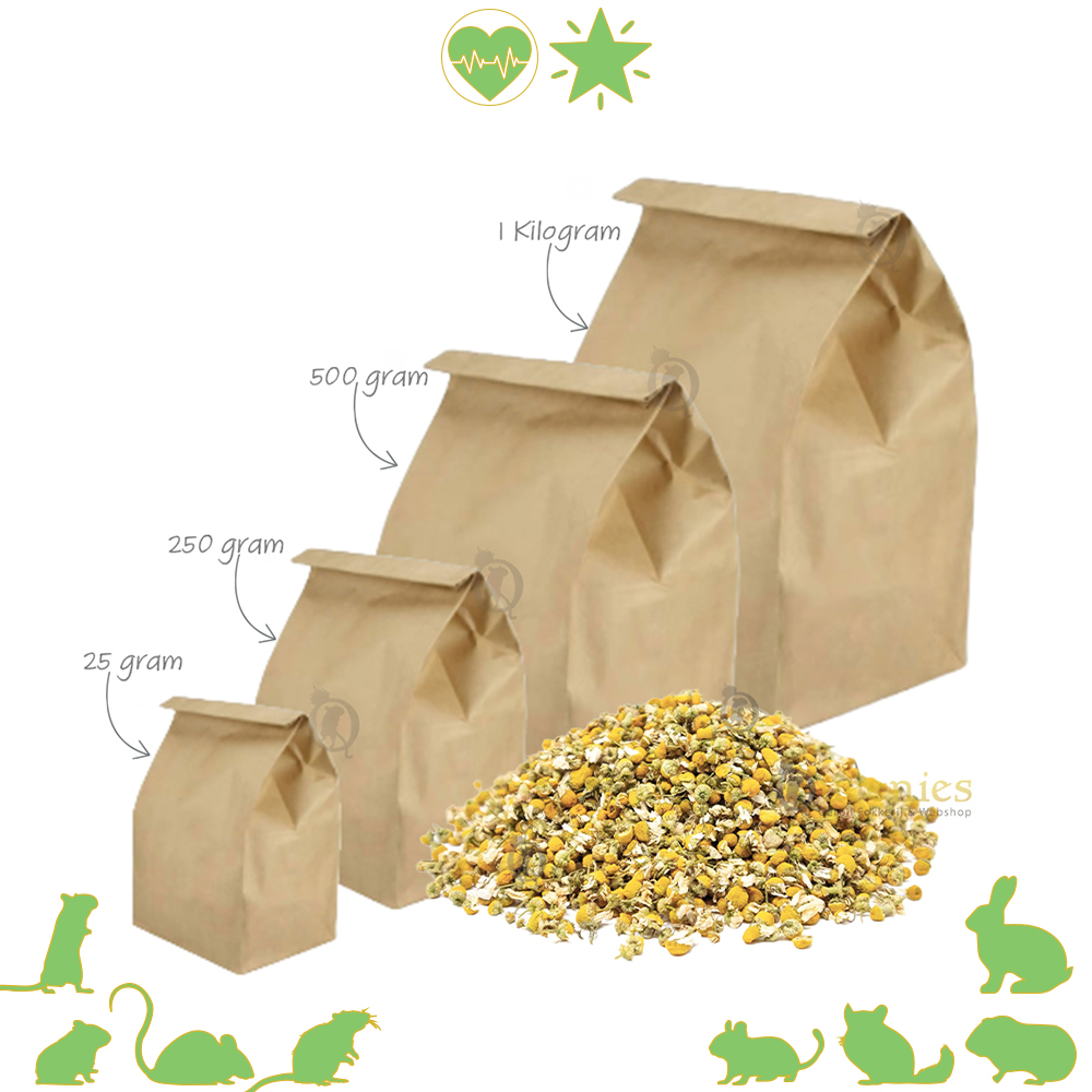 De Gedroogde Kamille bloemen voor Knaagdieren en Konijnen zijn zorgvuldig gedroogd waardoor smaak, geur en kleurstoffen uitmuntend bewaard zijn gebleven. Hierdoor heeft de Gedroogde Kamillebloem een veelzijdige werking bij Gerbils en andere Knaagdieren. Deze mooie kleine wit gouden kamille bloemen kunnen worden gebruikt als Dierenkruiden. Een klein handje toevoegen aan de basisvoeding van uw Hamster zorgt voor voedselverrijking en mentale stimulatie.