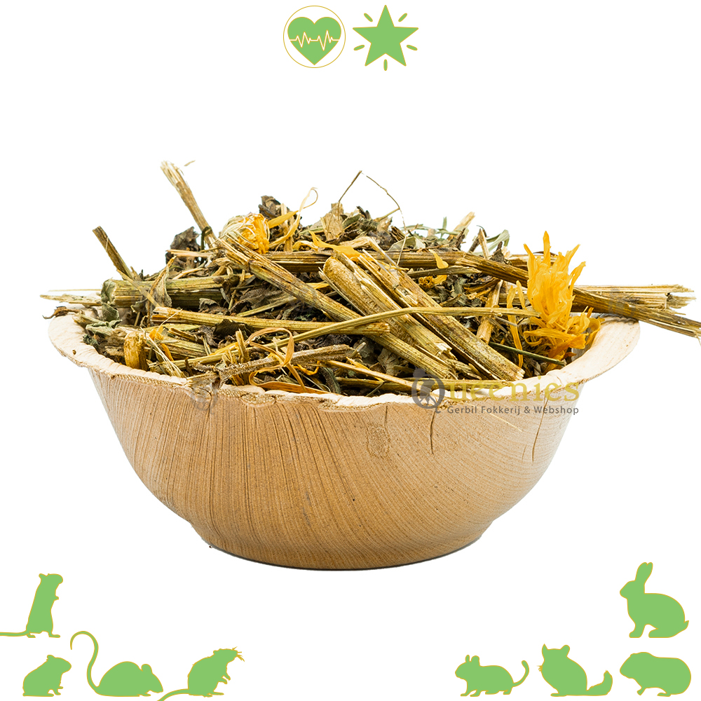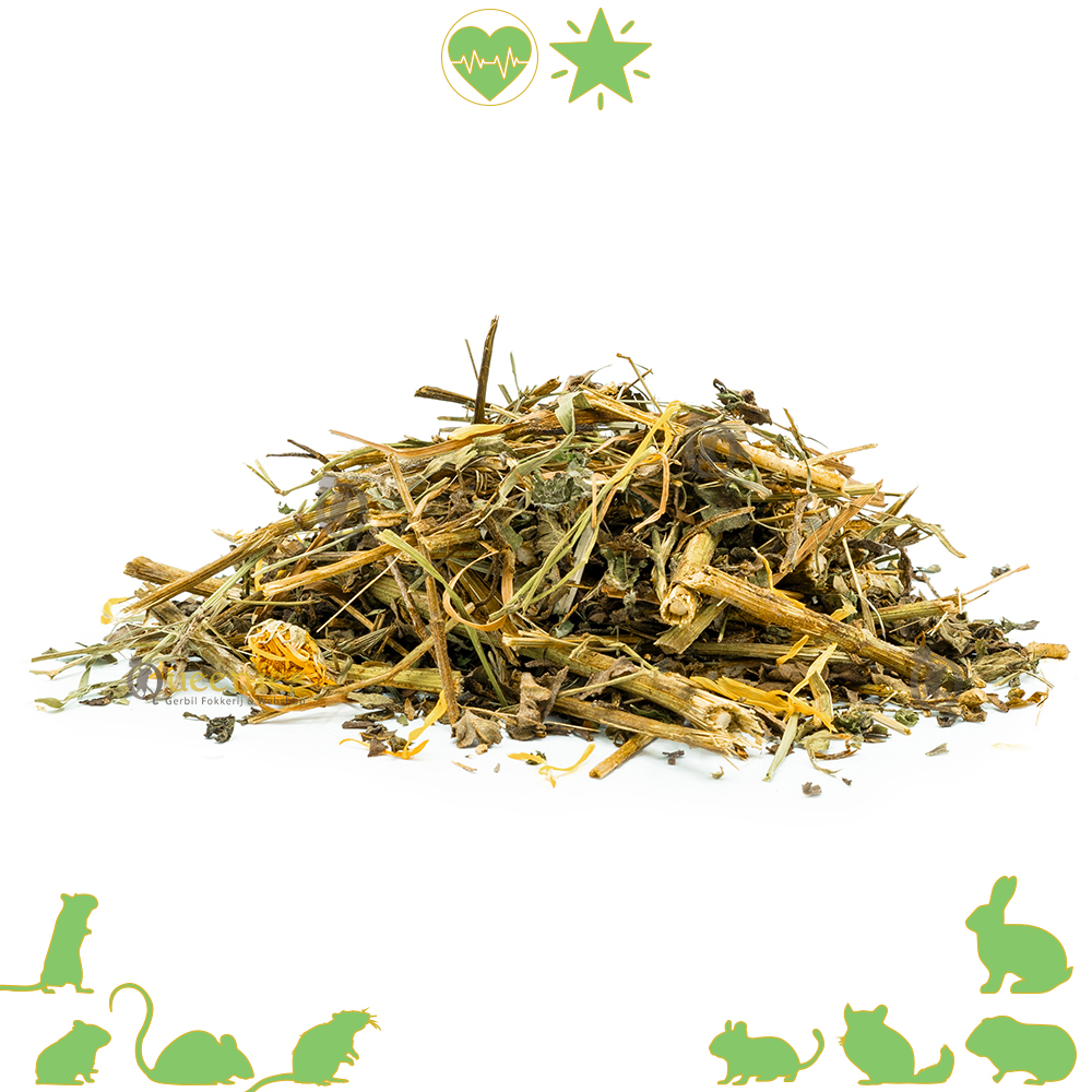 Wij hebben bewust gekozen om de samenstelling zo grof mogelijk te maken. Omdat er nu ook halve stelen tussen zitten geeft het veel textuur en variatie in deze mix. We hebben het extra aantrekkelijk gemaakt voor onze Knaagdieren en Konijnen. De bladeren van de aardpeerplant hebben een interessante smaak en textuur van de Aardpeerstokken vinden Knaagdieren erg aantrekkelijk. Het geven van verschillende smaken en texturen in het dieet van Knaagdieren en Konijnen is belangrijk om hun interesse in voedsel te behouden en verveling te voorkomen. Zij bijten namelijk graag op grove stukken takken en steeltjes.