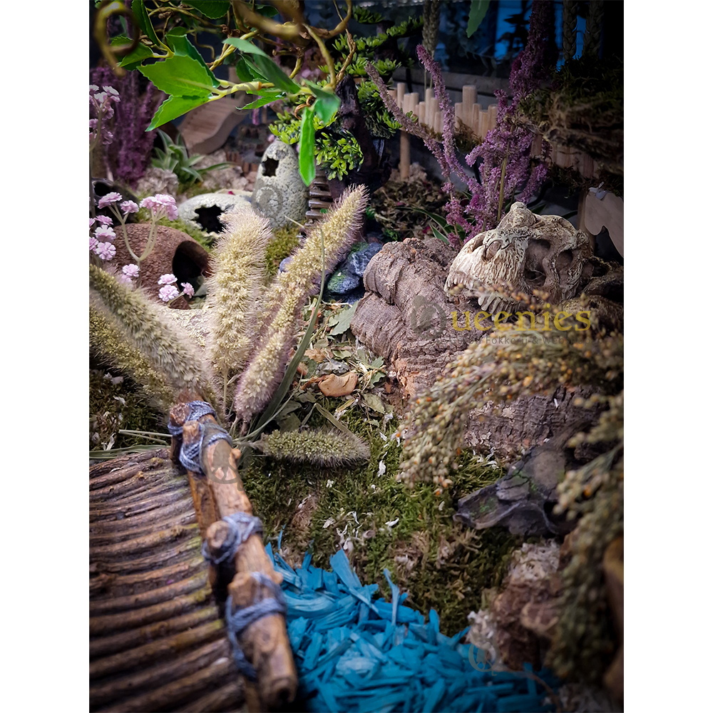 Wij hebben gebruikt gemaakt van verschillende artikelen. Waaronder de 'Sull's' Daarin hebben we meerdere varianten gebruikt waaronder bijvoorbeeld de T-Rex, maar ook de mini Skull's assorti. Naast doodshoofden is er ook gebruikt gemaakt van Patagonia Rotsen. Deze geven ook een hele natuurlijke twist aan de Hamsterscape thema. Ook werd er gebruik gemaakt van kunstmatige planten zoals de dunne Plantentak die mooi aan de Deksel van het Goudhamster Terrarium werd bevestigd. Natuurlijk werden er riviertjes en paden gemaakt van Color Wood en mag de Hamsterscape Brug ook nooit ontbreken in welk Hamsterscape thema dan ook.
