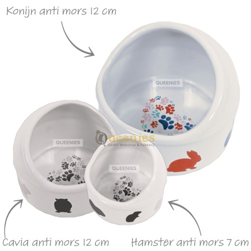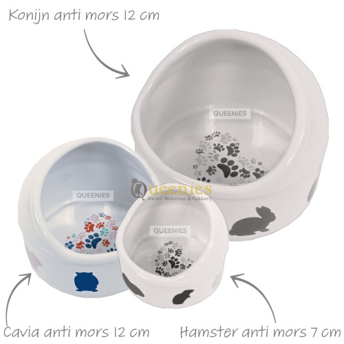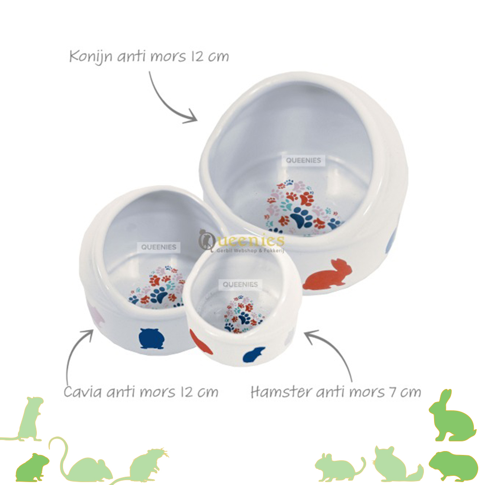 Gerbil eetbak aardewerk wit met pastel cavia print en een doorsnee van 11 cm, voorzien van een overkapping aan de achterzijde om het morsen tijdens het eten tegen te gaan. Deze voerbakken zijn redelijk aan de maat. Bij jonge dieren kan het zelfs gebruikt worden als kleine badzandschaal Afmeting: 9,4 x 12,5 x 12,5 cm