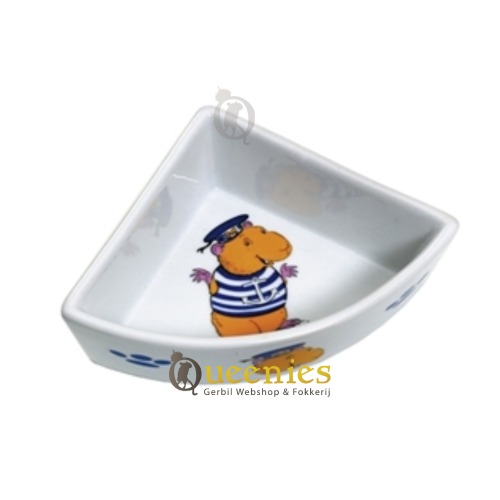 Grote hoekvoer bak van Karlie Wonderland. Past in ieder hoek van het verblijf. Met cavia print, leuk voor de kinderen thuis. Voor Gerbils is hij aan de grote kant met zijn 9cm doorsnee
