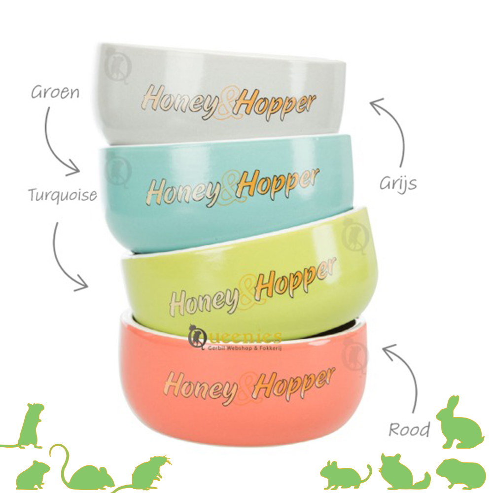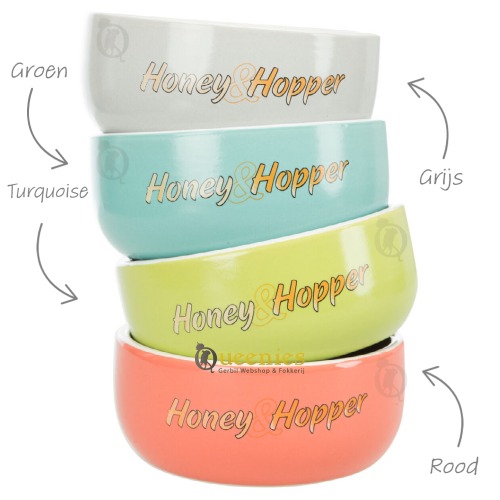 Honey en Hopper keramische voerbak van 11cm. Mooi ontworpen en een fijne grote voerbak die ook gebruikt kan worden als waterschaal voor Konijnen of Cavia's. Het is namelijk een stevig en robuuste voerbak of waterschaal die niet snel omgegooid zal worden. U kunt uw kleur keuze aangeven, wij kunnen u die helaas niet garanderen. Wel zullen wij ons uiterste best doen om uw wens in acht te nemen.