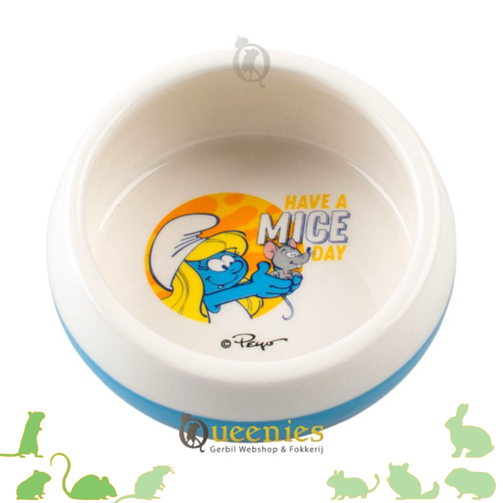 Deze keramieken eetkom met smurfin en de muis is vervaardigd uit gebakken aardewerk en dus heel stevig en stabiel. Dit model met aflopende rand zorgt voor een optimale toegankelijkheid tot het eten of drinken en vermijdt buitensporig smossen. Dankzij de kwalitatieve afwerking met glazuur is de kom zelf waterdicht om drinken in te serveren én zeer gemakkelijk schoon te maken. De leuke opdruk maakt het geheel af en garandeert een smurftastic maaltijd voor je konijn of knaagdier zoals gerbils en hamsters